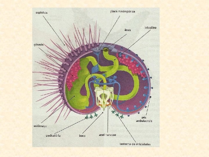 Sistema digestório ØCompleto (nos ofiuróides não há ânus). ØEstrelas-do-mar (hepatopâncreas). têm glândulas digestivas ØNo ouriço-do-mar existe a lanterna-de-Aristóteles (5 dentes no aparelho bucal) ØDigestão extracelular. Ø Nos crinoides tubo digestivo em U (boca ao lado do ânus (prosopígia).