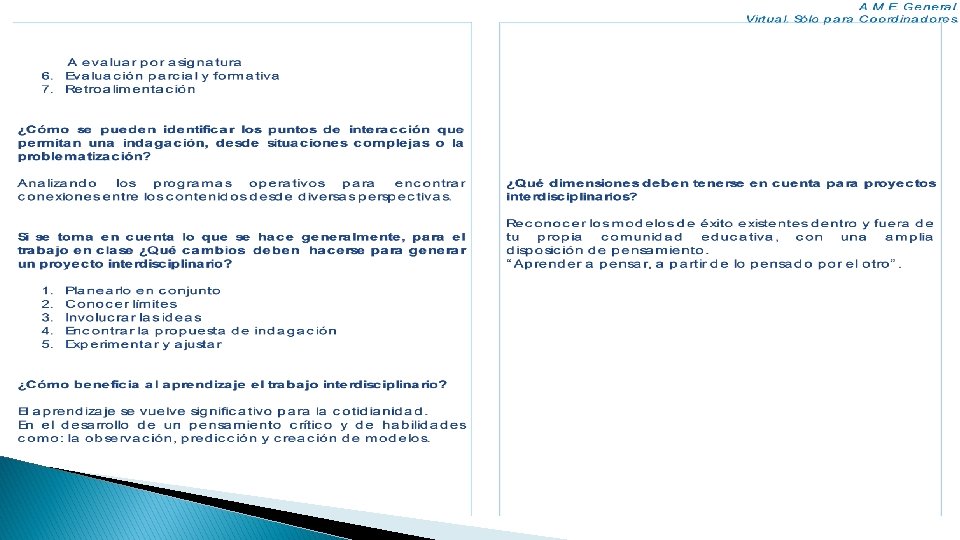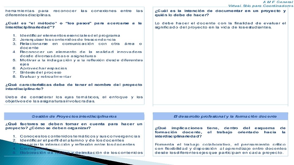 Indice: � � � 5. a Productos generados en la primera sesión de trabajo. Productos: 1. Producto 1. C. A. I. A. C. Conclusiones Generales. 2. Producto 3. Fotografías de la sesión tomadas por los propios grupos y la persona asignada para tal fin. 5. b Organizador gráfico que muestre los contenidos y conceptos de todas las asignaturas involucradas en el proyecto y su interrelación. (Producto 2. ) 5. c Introducción o justificación y descripción del proyecto. 5. d Objetivo general del proyecto y de cada asignatura involucrada. 5. e Pregunta generadora, pregunta guía, problema a abordar, asunto a resolver o a probar, propuesta, etcétera, del proyecto(s) a realizar. 5. f Contenido. Temas y productos propuestos, organizados en forma cronológica. Integrar diferentes tipos de evidencias o herramientas, por ejemplo: Manuscritas, digitales, impresas, físicas, documentos para planeación y seguimiento, etc. 5. g Formatos e instrumentos para/con la planeación, seguimiento, evaluación, autoevaluación y coevaluación. 5. h Reflexión sobre el proceso de planteamiento del proyecto. Logros alcanzados y aspectos a mejorar, expectativas para su realización. 5. i Productos del 4 en adelante. 5