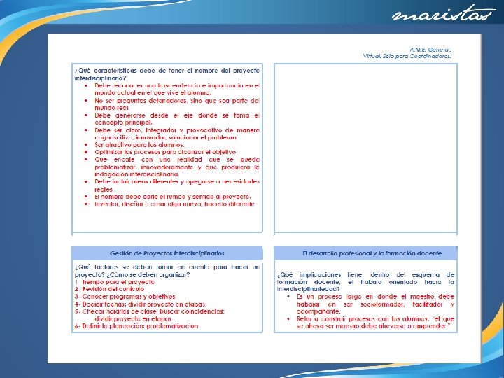 5. Llegar a conclusiones parciales útiles para el proyecto, de tal forma que lo aclaran, describen o descifran (fruto de la reflexión colaborativa de los estudiantes). ¿Cómo se logran? En cada asignatura se realizaron conclusiones que fungieron como los ejes principales para guiar el diseño del modelo. ∗ En plenaria se lanzaron las conclusiones disciplinarias y se acordaron las líneas de trabajo a seguir, con lo que se realizó la subdivisión del trabajo y los alumnos de acuerdo a sus intereses decidieron los roles que asumirían en el proceso: sociólogos, diseñadores gráficos, arquitectos, científicos, políticos y urbanistas. ∗ Cada “Profesión” profundizó en los conceptos que se trabajarían para diseñar el modelo. ∗ En sesiones plenarias se compartió la información para ensamblar el modelo y verificar si los conceptos de esta indagación quedaban lo suficientemente claros ya que la audiencia serían sus compañeros de secundaria y profesores. Cuidaron el lenguaje; se realizaron traducciones ya que la primer parte del modelo se presentaría en inglés (lengua internacional y seleccionada por los alumnos como lengua oficial de su ciudad ideal). ∗ En colaborativo se realizaron retroalimentaciones y se detectaron logros y áreas de oportunidad, sobre las cuales se trabajó. ∗ Se presentó el modelo a una muestra del “target group” para recibir retroalimentación final.