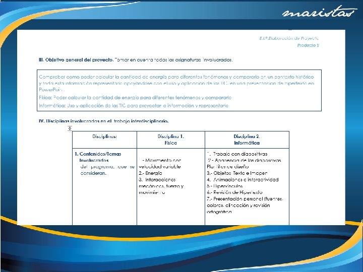 5. b Producto 2 Organizador Gráfico del Proyecto Cómo usamos nuestra energía FISICA 1. -Movimiento con velocidad variable 2. - Energía 3. - Interacciones mecánicas, fuerza y movimiento HISTORIA Contexto histórico desde la prehistoria hasta la actualidad INFORMATICA 1. - Operaciones con diapositivas 2. - Apariencia de las diapositivas. Plantillas de diseño 3. - Objetos Texto e Imagen 4. - Animaciones e interactividad 5. - Transiciones e intervalos 6. - Vista Previa de los efectos de animación en una diapositiva 7. - Hipervínculos