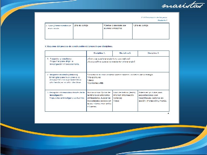 IV. Disciplinas involucradas en el trabajo interdisciplinario. Disciplinas: 1. Contenidos / Temas involucrados ¿Qué temas y contenidos del programa están considerados? Disciplina 1. Morfofisiología Análisis de posibles repercusiones anatómicas y fisiológicas. Disciplina 2. Física Construcción de un modelo. Disciplina 3. ____________ Disciplinas: Disciplina 1. Disciplina 2. _ Literatura____ 1. Contenidos / Temas involucrados ¿Qué temas y contenidos del programa están considerados? Disciplina 3. Español Postmodernismo Sociedades Utópicas Distópicas Características de la Literatura postmoderna Contextos económico, político social del siglo XXI Kurt Vonnegut y la literatura distópica Slaughter´s house-Five Lois Lowry: “El dador de recuerdos”. Neil Gaiman Stephen King Análisis Literario __ Informática___ El debate Evolución de las lenguas Introducción a Dreamweaver Creación de un sitio Texto Tablas Plantillas CSS Imágenes Capas y comportamientos Formulario Realidad aumentada Modelaje en 3 D Video 360 Cambio Colaboración, Adaptación. Construcción social de la realidad. Innovación Colaboración Indagacióny análisis. Desarrollo de ideas Objetivo Específico Creación de la solución Evaluación. 2. Conceptos clave, trascendentales. ¿Cuáles son los conceptos básicos que surgen del proyecto, permiten la comprensión del mismo y trascienden a otros ámbitos? Forman parte de un Glosario. Inicio de la marcha bípeda. El calzado al amortiguar la marcha evita las fuerzas de choque en las piernas y el esqueleto. Al elevar el hueso calcáneo, modifica el centro de gravedad y para minimizar esto se impulsa la pelvis hacia adelante causando hiperlordosis lumbar. El uso del calzado permite una marcha El producto pasó de ser un objeto simplemente más segura y amortigua el impacto utilitario a ser un elemento de distinción social. durante la marcha. El tacón en el calzado altera la relación de la verticalidad cambiando la distribución de los esfuerzos. Pérdida de estabilidad al modificar el centro de gravedad. 3. Objetivos o propósitos alcanzados. Establecer vínculos entre ambas materias integrando conocimientos. El trabajo implicó el uso de TICs. Construcción de gráficas de movimiento. Interpretación de gráficas. Uso de representaciones múltiples. 4. Evaluación. Productos /evidencias de aprendizaje. ¿Cómo se demuestra que se avanza en el proceso y que se alcanza el objetivo propuesto? El trabajo se revisó una vez por semana con asesorías de retroalimentación permanente. Se presentan resúmenes de las investigaciones fotografías pruebas de laboratorio, graficas comparativas, resultados de encuestas. 5. ¿Qué tipos de Evaluación emplean? ¿Qué herramientas se utilizan para ello? Cuestionarios, Resúmenes, Tablas, Reportes, Rúbricas. 2. Conceptos clave, trascendentales. ¿Cuáles son los conceptos básicos que surgen del proyecto, permiten la comprensión del mismo y trascienden a otros ámbitos? Forman parte de un Glosario. Empatía y Propósito 3. Objetivos o propósitos alcanzados. Comprensión de textos orales y visuales Expresar pensamientos, emociones, ideas, opiniones, emociones de forma oral y escrita. Propiciar una conciencia y entendimiento de las perspectivas de la gente de otras culturas y la propia dado una tiempo en la historia Organización 4. Evaluación. Productos /evidencias de aprendizaje. ¿Cómo se demuestra que se avanza en el proceso y que se alcanza el objetivo propuesto? Objetivo Específico C: Comprensión de textos orales y visuales iii. Expresar pensamientos, emociones, ideas, opiniones, emociones de forma oral y escrita. iv. Propiciar una conciencia y entendimiento de las perspectivas de la gente de otras culturas y la propia dado una tiempo en la historia. Objetivo específico B: Organización i Usar estructura organizativas adecuadas al contexto y la intención. Objetivo específico D: Uso de la lengua i Usar un vocabulario, estructuras sintácticas y formas de expresión apropiados y variados. ii Escribir y hablar empleando un registro y un estilo adecuados al contexto y la intención. Objetivo específico A: Indagación y análisis. Objetivo Específico B: Desarrollo de ideas Objetivo Específico C: Creación de la solución Objetivo Específico D: Evaluación. 5. ¿Qué tipos de Evaluación emplean? ¿Qué herramientas se utilizan para ello? Los profesores evaluaron bajo los criterios PAI de cada asignatura y los de interdisciplinariedad Los profesores evaluaron bajo los criterios PAI de cada asignatura y los de Interdisciplinariedad Usar estructura organizativas adecuadas al contexto y la intención. Objetivo específico D: Uso de la lengua Usar un vocabulario, estructuras sintácticas y formas de expresión apropiados y variados. Escribir y hablar empleando un registro y un estilo adecuados al contexto y la intención.