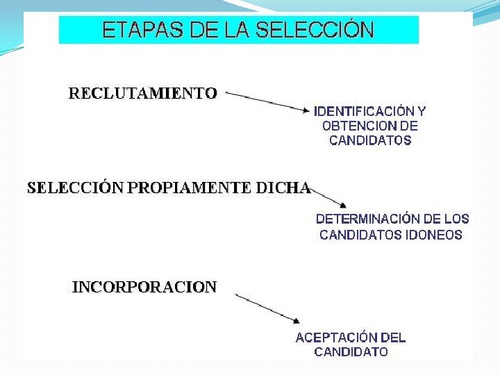 ¿QUÉ ES SELECCIÓN ? Es el proceso que consta de pasos específicos que deben seguirse para decidir que solicitante cubrirá el puesto vacante. La función del administrador de recursos humanos consiste en ayudar a la organización a identificar al candidato que mejor se adecue a las necesidades del puesto y necesidades de la organización.