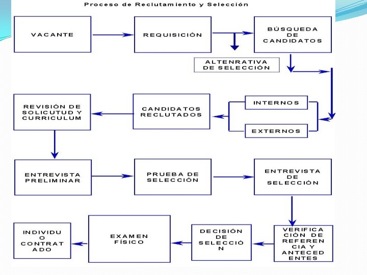 PROCESO DE SELECCIÓN DE PERSONAL �Seleccionar al personal consiste en escoger entre los candidatos reclutados, los más adecuados para ocupar cargos, manteniendo la eficiencia y eficacia en el área que se le asigne. PASOS PARA LA SELECCIÓN : • Recepción preliminar de solicitudes · Pruebas de idoneidad · Entrevista de selección · Verificación de datos y referencias · Examen médico · Entrevista con supervisor · Descripción del caso · Decisión de contratar