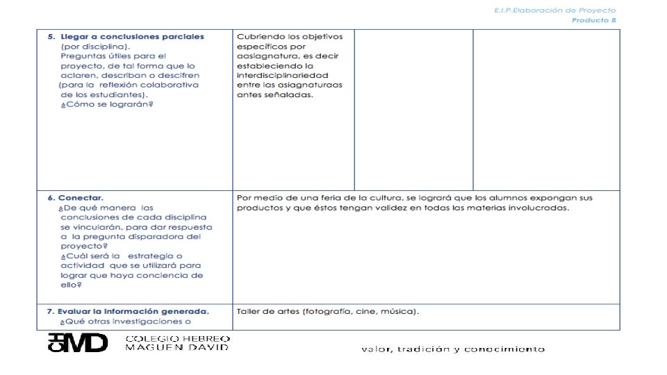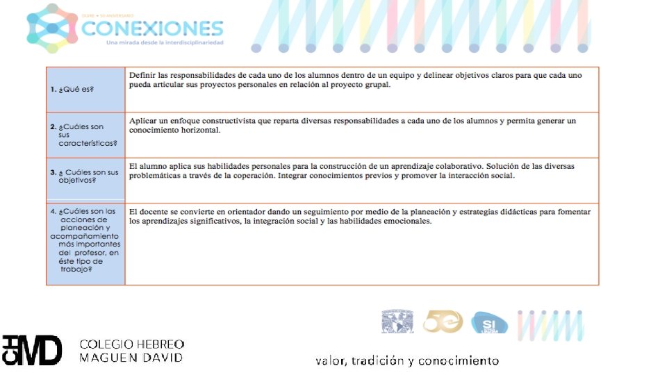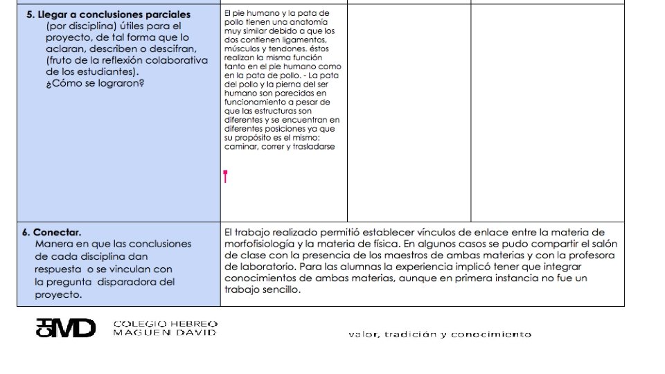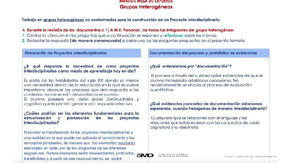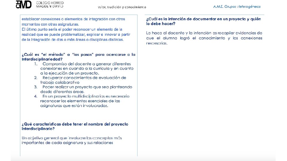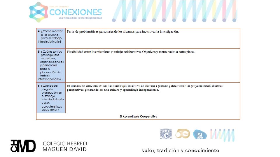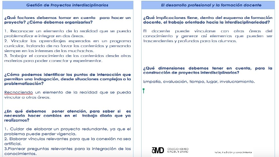 • Compromiso del docente a generar diferentes conexiones en cuando a la currícula y en cuanto a la ejecución de un proyecto. • Recuperar conocimientos de evaluación de trabajo colaborativo • Poder realizar un proyecto que sea planteando desde diferentes áreas. • En un proyecto multidisciplinarios es necesario reconocer los elementos esenciales de las asignaturas que están involucradas. • Reconocer con toda precisión cuáles son las características los elementos, los conceptos involucrados en cada uno de los contenidos que son esenciales dentro de su programa. • Encontrar su transferencia a una realidad en la que puede ser aplicada dicho conocimiento y por lo tanto parece que los elementos que tienen que ser esenciales es que los profesores conozcan perfectamente su programa. Los elementos que son trascendentes, que son profundos, que son transferibles y a partir de ese reconocimiento se pueda establecer conexiones o elementos de integración con otros momentos con otras asignaturas. • El último punto sería el poder reconocer un elemento de la realidad que se puede problematizar que se puede explicar e innovar a partir de la integración de dos áreas disciplinarias distintas • También elemento problematizadora de la realidad se construya un proyecto en el cual se vinculen los aprendizajes esperados en un programa curricular. tratando de no forzar los contenidos pensar en los intereses de los muchachos conocer cuáles son los grandes cuestionamientos que existen en el mundo actual y ver a partir de de dos áreas disciplinares o tres áreas disciplinares que me ayuden a abordarlo con mayor profundidad y desde diferentes perspectivas. • Interdisciplinariedad es trabajar en el conocimiento de los contenidos de las otras materias para poder conectar para poder experimentar desde mi materia.