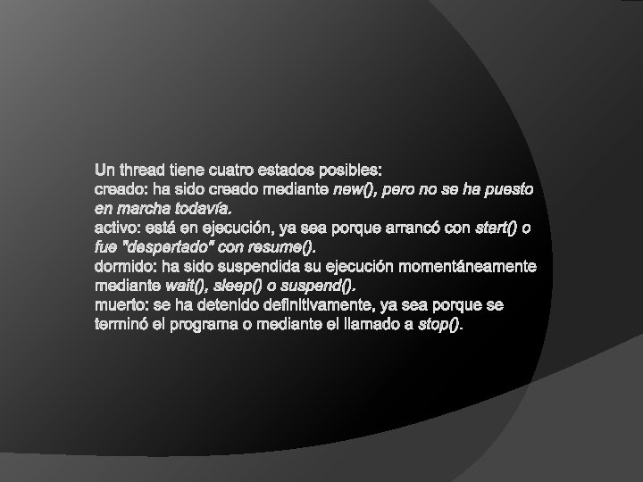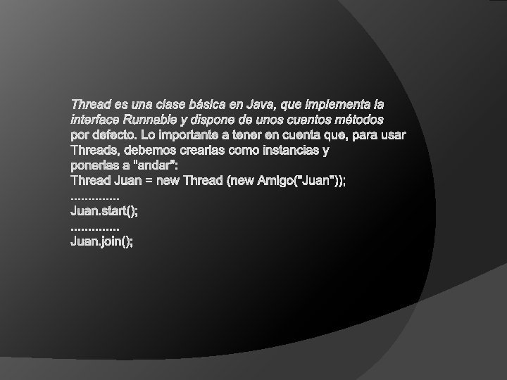 Java es multithreading. Esto significa algo así como que tiene capacidad de diálogo, y más aún: puede ejecutar muchos threads en paralelo, como si tratáramos de una conversación múltiple y simultánea. No confundir aquí multithreading con la capacidad de ejecutar varios programas a la vez. Esta es una posibilidad, pero también un mismo programa puede utilizar varios threads ("caminos de ejecución"? ) simultáneamente. Esto, por supuesto, depende fundamentalmente de la capacidad del sistema operativo para soportar multithreading, y por esto Java no puede ejecutarse (al menos en forma completa) en sistemas que no lo soporten.