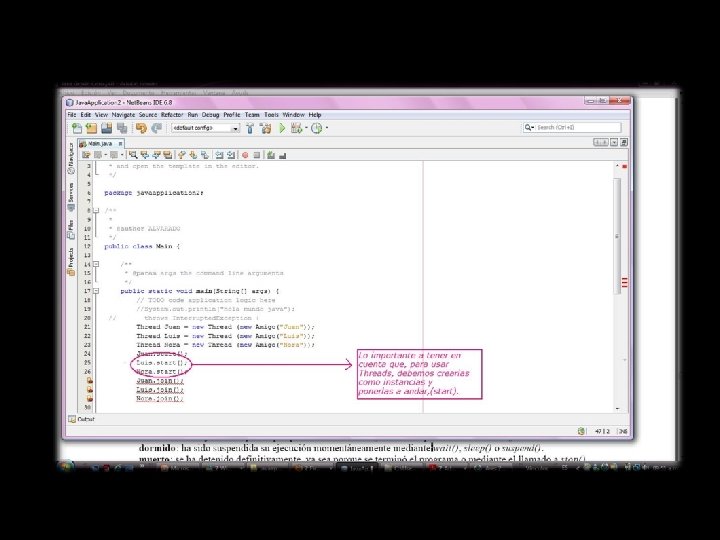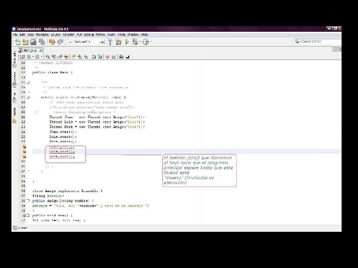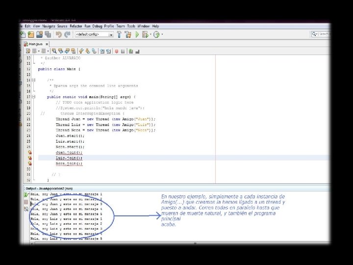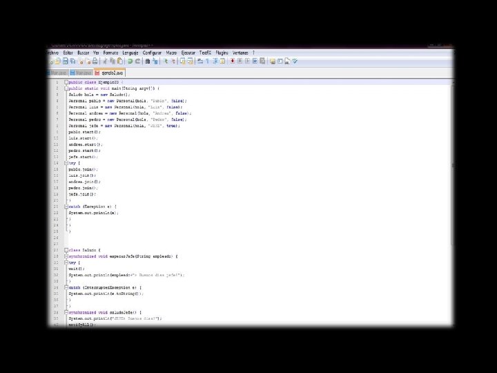 Usé notify. All() en lugar de notify(), porque en el segundo caso sólo se notificaría al primer thread (el primer empleado en llegar) y no a los demás, que se quedarían en el wait(). Como se ve en la salida, a pesar de que los empleados están en condiciones de saludar, no lo hacen hasta que no llega el jefe: (Pablo llega) (Luis llega) (Andrea llega) (Pedro llega) (JEFE llega) JEFE> Buenos dias! Luis> Buenos dias jefe! Pedro> Buenos dias jefe! Andrea> Buenos dias jefe! Pablo> Buenos dias jefe!