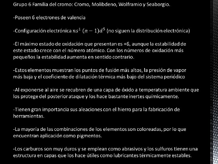 Cromo • Etimología: Khroma • Número atómico 24 • Valencia 2, 3, 4, 5, 6 • Estado de oxidación +3 • Electronegatividad 1, 6 • Radio covalente (Å)1, 27 • Radio iónico (Å)0, 69 • Radio atómico (Å)1, 27 • Configuración electrónica [Ar]3 d 54 s 1 • Primer potencial de ionización (e. V) 6, 80 • Masa atómica (g/mol)51, 996 • Densidad (g/ml) 7, 19 • Punto de ebullición (ºC) 2665 • Punto de fusión (ºC)1875 • Descubridor Vaughlin en 1797