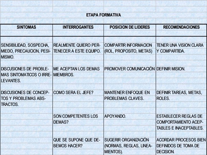 Formación • Prioridades: el enfoque y compromiso • Experiencia individual: Incertidumbre • Integración grupal: Preguntas y respuesta breves • Logros: compromiso individual • Problemas potenciales: Rechazo, Confusión, Apatía y desconfianza