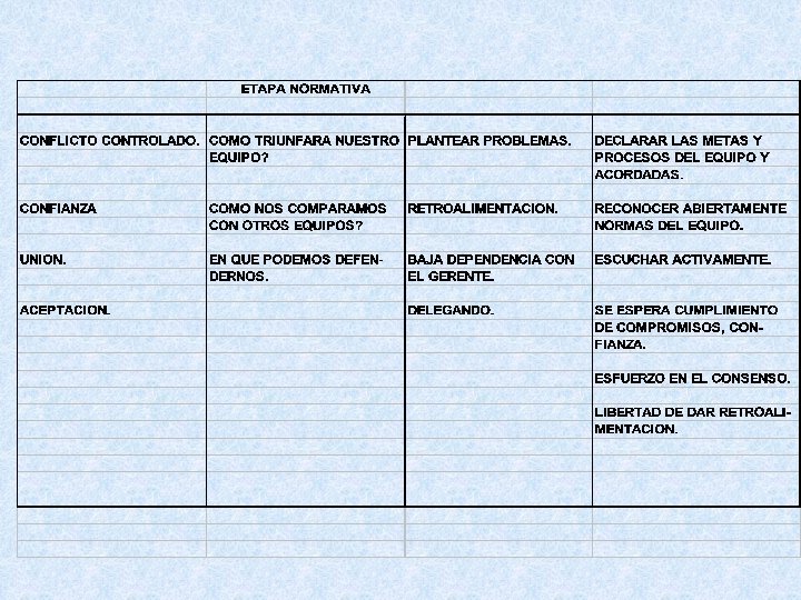 Normativa • Prioridades: Organización y comunicación • Experiencia: Sentimiento de pertenencia • Integración: Se fortalece el consenso y la cooperación • Logros: Misión del equipo roles definidos, retroalimentación constructiva • Problemas: Evitar conflictos, Evasión a reuniones, inflexibilidad en las opiniones.