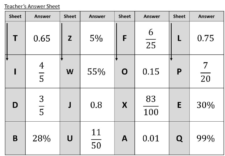 Equivalence – Fractions, Decimals & Percentages – Treasure Trail Individual students (or pairs) can start the trail at any question poster. Once they have calculated the answer they should then find the poster that has that answer at the top. Students go from one question to the next until they have completed the full circular trail. Students should record the letters of the questions they have completed. (Clear plastic wallets around your classroom make it quick and easy to display posters. )