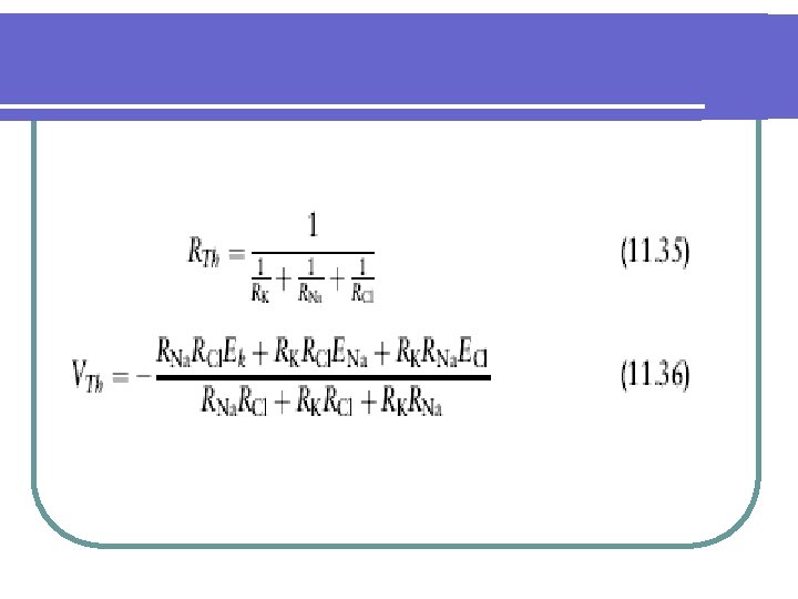 Capacitive Property Capacitance occurs whenever electrical conductors are separated by an insulating material. In the neuron, the cytoplasm and extracellular fluid are the electrical conductors and the lipid bilayer of the membrane is the insulating material (Fig. 11. 3). Capacitance for a neuron membrane is approximately 1 m. F=cm 2. Membrane capacitance implies that ions do not move through the membrane except through ion channels. The membrane can be modeled using the circuit in Figure 11. 15 by incorporating membrane capacitance with the electromotive and resistive properties. A consequence of membrane capacitance is that changes in membrane voltage are not immediate but follow an exponential time course due to first-order time constant effects. To appreciate the effect of capacitance, the circuit in Figure 11. 15 is reduced to Figure 11. 16 by using a The´venin equivalent for the batteries and the resistors with RTh and VTh given in Equations 11. 35 and 11. 36.