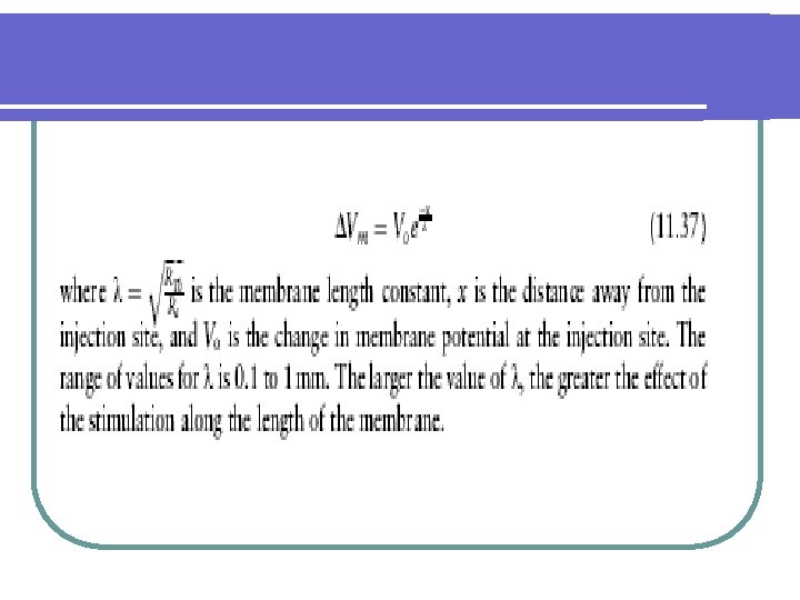resistance is important. Most of the current flows out through the section into which the current was injected since it has the smallest resistance (RTh) in relation to the other sections. The next largest current flowing out of the membrane occurs in the next section since it has the next smallest resistance, RTh þ Ra. The change in Vm, DVm, from the injection site is independent of Cm and depends solely on the relative values of RTh and Ra. The resistance seen in n sections from the injection site is RTh þ n Ra. Since current decreases with distance from the injection site, then DVm also decreases with distance from the injection site because it equals the current through that section times RTh. The change in membrane potential, DVm, decreases exponentially with distance and is given by