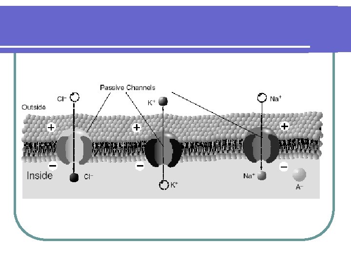Nerve Membrane l The nerve membrane is a lipid bilayer that is pierced by a variety of different types of ion channels Types of Ion Channels l Passive (always open) l Active (gates that can be opened). Note : Each ion channel is also characterized by its selectivity.