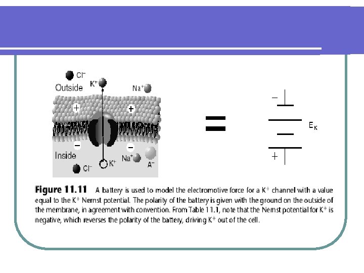 Across each ion-specific channel, a concentration gradient exists for each ion that creates an electromotive force, a force that drives that ion through the channel at a constant rate. The Nernst potential for that ion is the electrical potential difference across the channel and is easily modeled as a battery, as is illustrated in Figure 11. 11 for Kþ. The same model is applied for Naþ and Cl with values equal to the Nernst potentials for each.