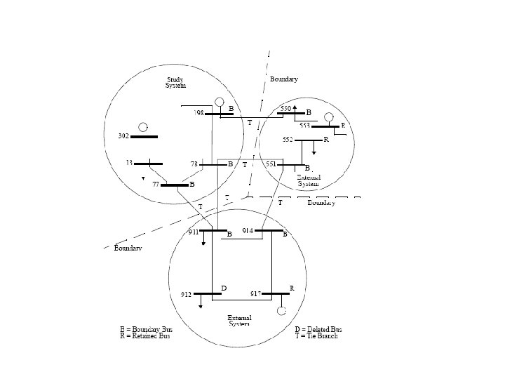 -La cantidad de nodos de la red original es 1773, y de la red equivalente es 1781 (se agregan los 8 nodos en que las máquinas equivalentes se conectan a las barras PV originales de las máquinas equivalentadas) -Se desea ahora buscar un equivalente que permita reducir los nodos de carga y algunos nodos de generación “poco importantes” del sistema externo, de forma que el tamaño del sistema equivalente sea más “manejable”. -El nuevo equivalente se forma a partir de la linealización de las ecuaciones algebraicas del sistema en torno al punto de equilibrio inicial, de ahí que se hable de un equivalente “estático”.