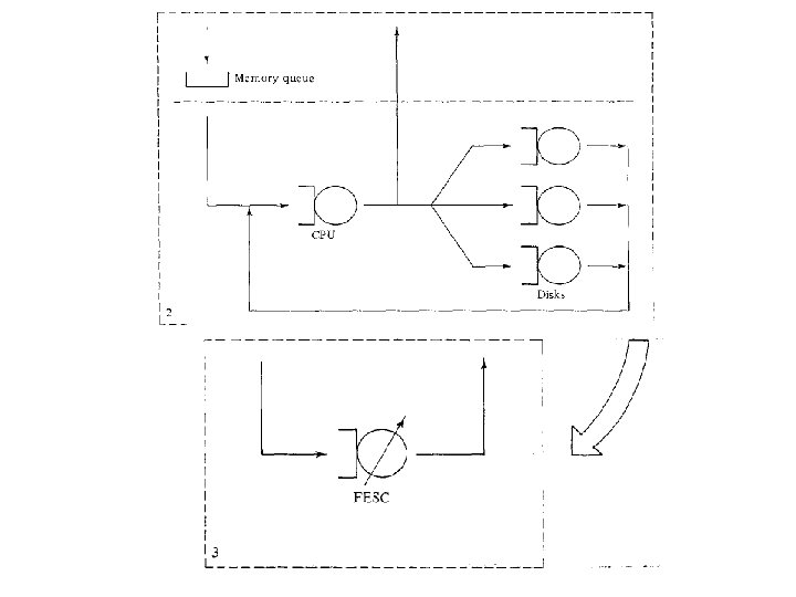 Exemplo 2 Lazowska, cap 9 Avalie o modelo de alto nível com o FESC, obtendo: Tempo médio gasto no subsistema central (Little): R = N / X = 2. 6/0. 175 = 14. 9 s Tempo médio esperando por memória W = 25. 7 – 14. 9 = 10. 8 s Utilização dos dispositivos (Uk = XDk) Ucpu = 0. 175*3 = 52. 5% Udisk 1 = 0. 175*4 = 70% Udisk 2 = 0. 175*2 = 35%