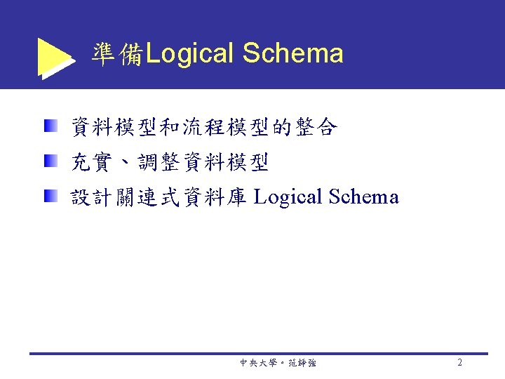 從 ER 到 Logical Schema ──兼談Schema Integration 國立中央大學 資訊管理系 范錚強 2020. 08 updated 中央大學。范錚強 1