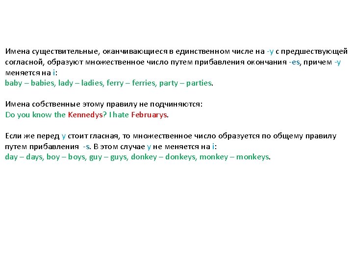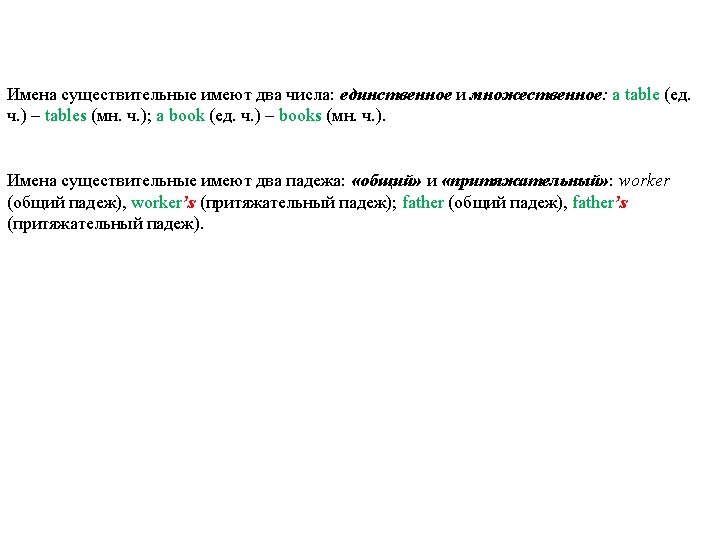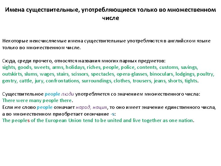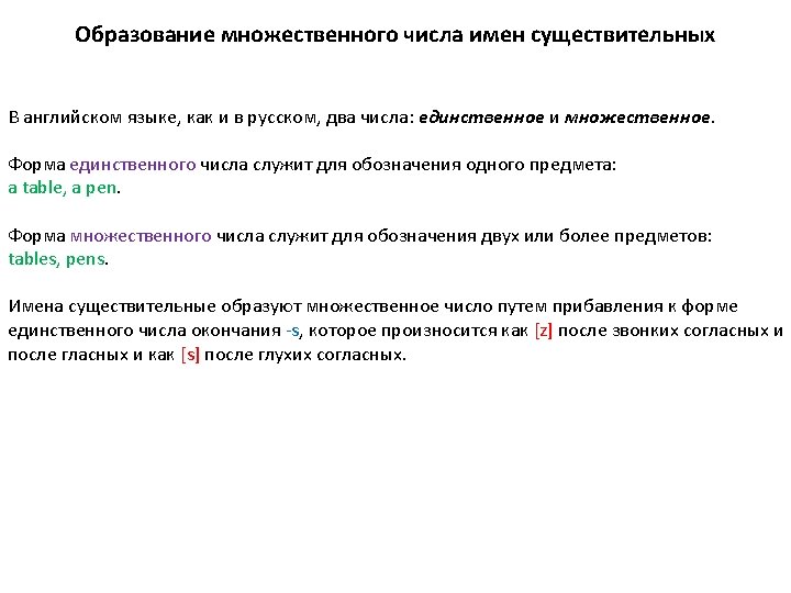 Составные имена существительные образуют множественное число различными способами. Как правило, окончание -s прибавляется к главному слову: passer-by – passers-by, runner-up – runners-up, mother-in-law – mothers-in-law, forget-me-not – forget-me-nots, merry-go-round – merry-go-rounds, custom-house – custom-houses, man-ofwar – men-of-war, man-driver – men-drivers, woman-doctor – women-doctors.