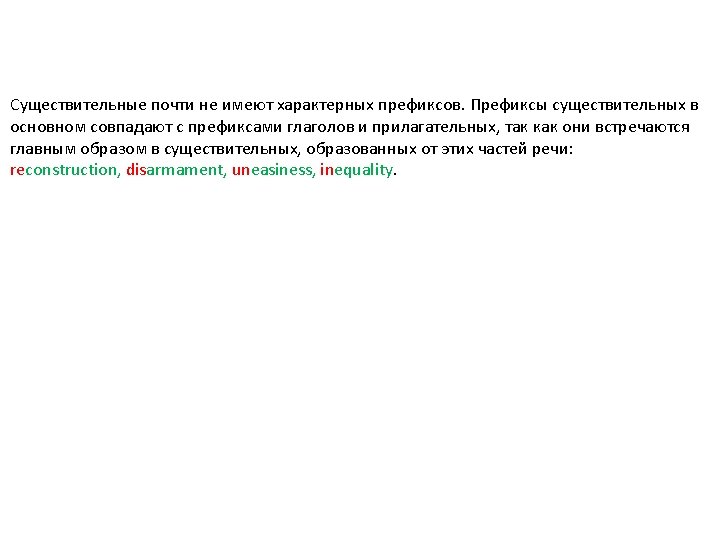 К наиболее характерным суффиксам производных существительных относятся: -er: -ment: -ness: -ion: -dom: -hood: -ship: worker, writer development, government happiness, kindness restriction, connection freedom, wisdom childhood, neighbourhood leadership, friendship