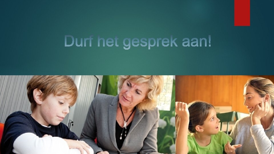 Mogelijke vragen Ga jij het gesprek met het kind al aan? Hoe ga jij dat gesprek dan aan? Wat lukt er al in dat gesprek? Wat lukt er nog niet in dat gesprek? Wat heb je nu nodig om morgen het gesprek aan te gaan?