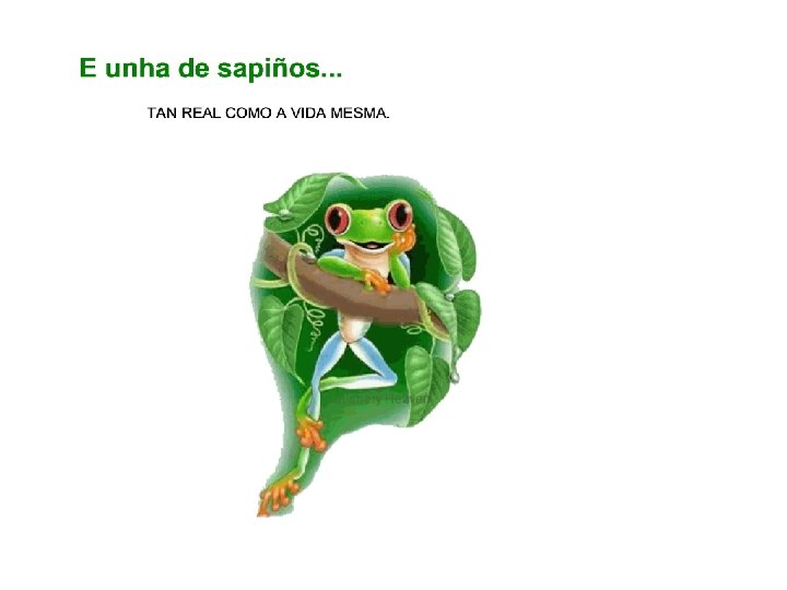 E os sapiños estaban dándose por vencidos Salvo aquel sapiño que seguía tranquilo e agora cada vez con máis forza. Xa chegando ao final da competición todos desistiron, menos ese sapiño que curiosamente, en contra de todos, seguía e puido chegar ao cumio con todo o seu esforzo. Os outros querían saber o qué lle pasara. Un sapiño foi preguntarlle cómo conseguira concluir a proba.