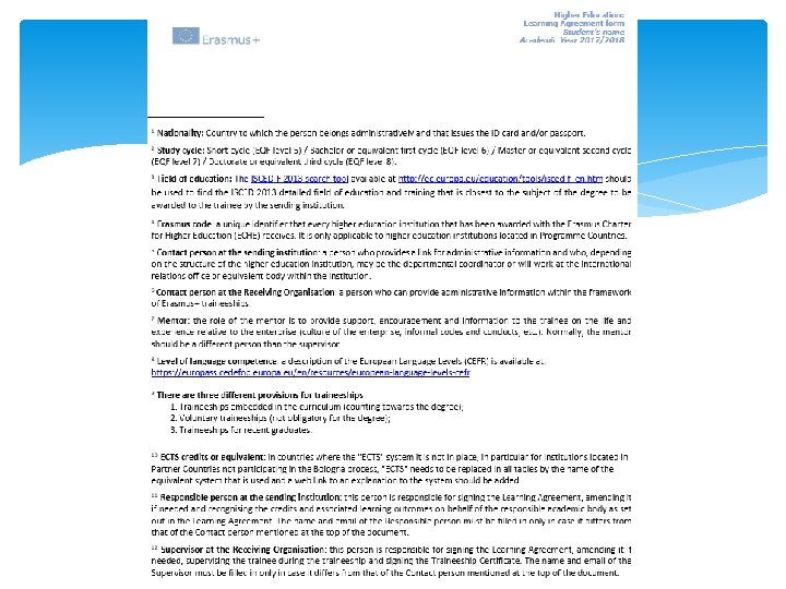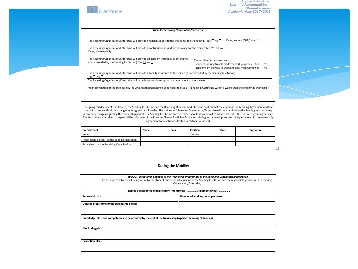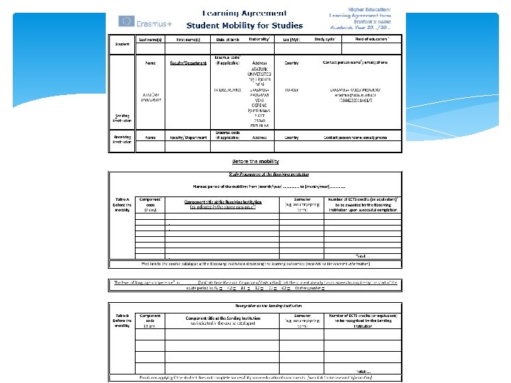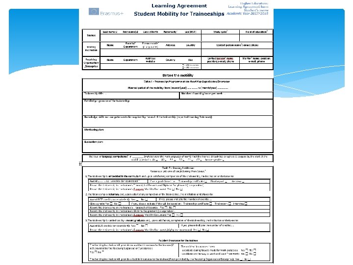 Staj Hareketlilik Anlaşması ( Learning Agreement for Traineeship Mobility) Ø Öğrenci, bu belgeyi bölüm Erasmus+ koordinatöründen yardım alarak hazırlayabilir. Gidilecek kurumda yapılacak staj ile ilgili yapılacak stajın kazanımları detaylı bir şekilde bu belgede belirtilir ve gidilen kurumun bilgileri kurumdan istenir. Ø Belge doldurulduktan sonra bölüm Erasmus+ koordinatörü, Dış İlişkiler Ofisi Kurum koordinatörü, ve sizin imzanızın ardından, karşı kuruma imza için email olarak gönderilebilir.