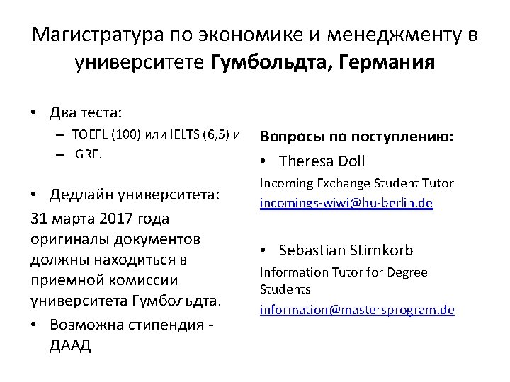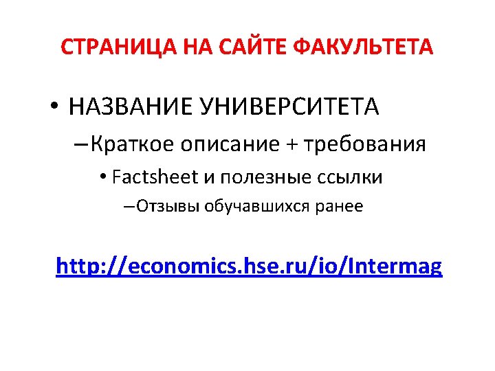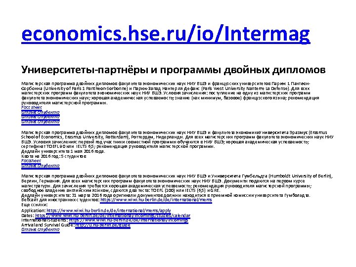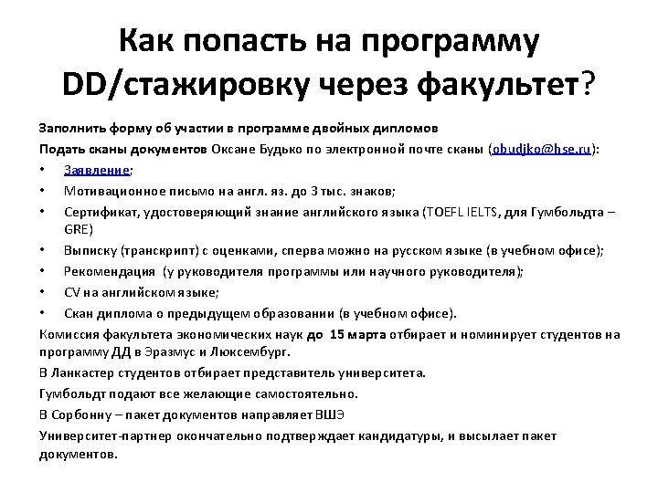 Университеты – партнеры факультета по программам двойных дипломов • Erasmus School of Economics (Erasmus University Rotterdam) – 5 мест • University of Luxembourg - 4 места • Университеты, которые отбирают сами: • Lancaster University Management School • Humboldt University • Sorbonne – Pantheon Paris I