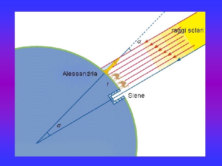 La differenza di inclinazione di 7, 2° dipende dalla curvatura della superficie terrestre che cambia il punto di vista dal quale gli abitanti delle due città vedono il Sole. Egli ragionò in questo modo: l'angolo di 7, 2° è congruente all'angolo che ha per vertice il centro della Terra e i cui lati passano rispettivamente per Alessandria e Siene (infatti sono angoli corrispondenti). Si tratta quindi di una "distanza angolare" tra le due città, pari a un cinquantesimo dell'angolo giro.