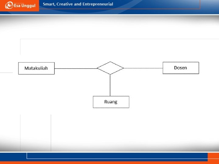 RELASI (relation) Relasi atau hubungan adalah kejadian atau transaksi yang terjadi di antara dua entitas yang keterangannya perlu disimpan dalam database. Aturan penggambaran relasi antar entitas adalah: • Relasi dinyatakan dengan simbol belah ketupat. • Nama relasi dituliskan di dalam simbol belah ketupat. • Relasi menghubungkan dua entitas. • Nama relasi menggunakan kata kerja aktif (diawali awalan me) tunggal. • Nama relasi sebisa mungkin menggunakan nama yang mudah dipahami dan dapat menyatakan maknanya dengan jelas.