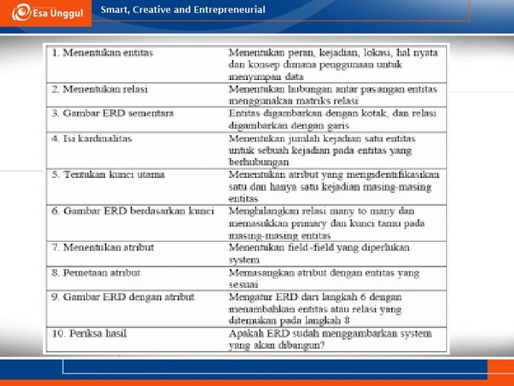 ENTITAS (entity) Entitas menunjukkan objek-objek dasar yang terkait di dalam sistem. Objek dasar dapat berupa orang, benda, atau hal lain yang keterangannya perlu disimpan dalam database. Untuk menggambarkan entitas dilakukan dengan cara mengikuti aturan berikut: • Entitas dinyatakan dengan simbol persegi panjang. • Nama entitas berupa kata benda tinggal • Nama entitas sebisa mungkin menggunakan nama yang mudah dipahami dan menyatakan maknanya dengan jelas.