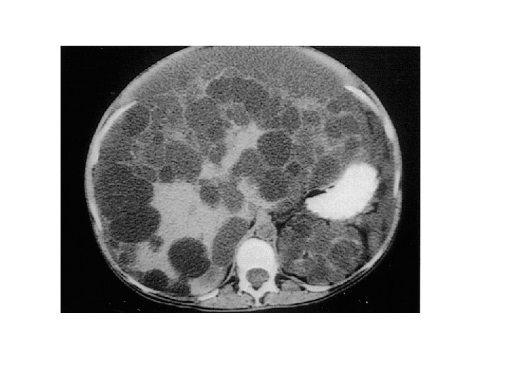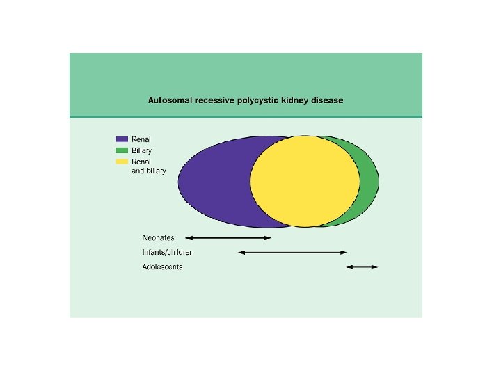Rene policistico infantile (ARPKD: Autosomic Recessive PKD) • 1 ogni 20000 nascite • Gene anomalo: fibrocistina (PKHD 1) 6 p 21 -23 • Cisti sacciformi – 1 -2 mm x 1 -8 mm – Dotti collettori – Disgenesia biliare ARPKD in un neonato. L’ecografia ad alta risoluzione, pannello superiore, mostra dotti collettori dilatati (frecce) a disposizione radiale. La TAC contrasto (pannello inferiore) mostra un nefrogramma striato.