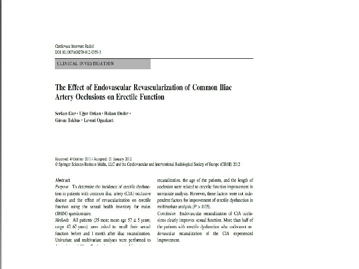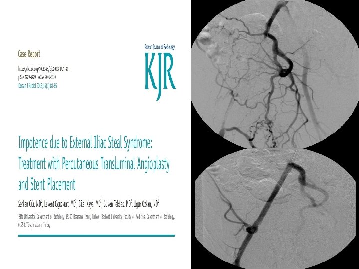 ENDOVASKÜLER TEDAVİ � Oral medikal tedaviye yanıt yoksa � Cerrahi tedavi düşünülmüyor ve penil protez öncesi minimal invaziv (endovasküler) tedaviye şans vermek � Arteryel hastalıkta: rekanalizasyon/PTA/Stentleme/ilaç kaplı stent (2009 ZEN çalışması, 2012 LINC sunumu) � Veno-oklüziv hastalık: embolizasyon (antegradperkütan/retrograd-transfemoral)