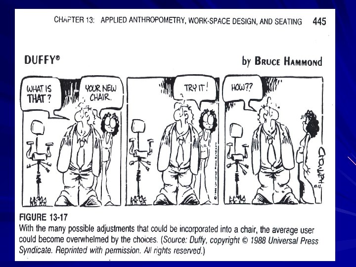 PRINSIP PENERAPAN ERGONOMI ü Bentuk dan ukuran alat serta fasilitas agar disesuaikan dng bentuk dan ukuran tubuh tenaga kerja ü Menghindari kontraksi statis sedapat mungkin tak melebihi 15 % kekuatan maksimal ü Usahakan posisi dan sikap tubuh yg alamiah waktu bekerja ü Sedapat mungkin menghindari sikap berdiri diam saat bekerja ü Pengaturan irama kerja agar sesuai dengan irama pemulihan