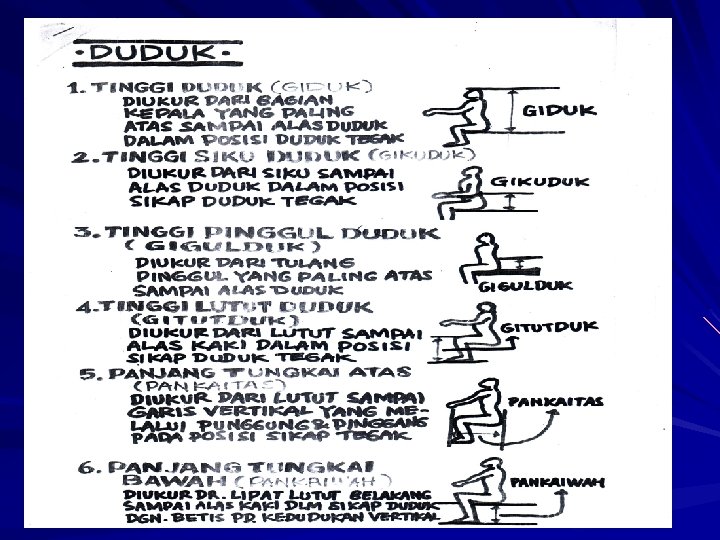 SIKAP DUDUK KEUNTUNGAN 1. Mengurangi kelelahan pada kaki 2. Terhindarnya sikap yg tidak alamiah 3. Berkurangnya pemakaian energi KERUGIAN 1. Melembeknya otot perut 2. Melengkungnya punggung 3. Efek buruk bagi organ bagian dalam
