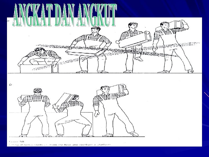 Prinsip kerja angkat-angkut Pegangan harus kuat Lengan berada sedekat-dekatnya dengan badan dalam posisi lurus Punggung harus lurus Posisi kaki dibuat sedemikian rupa sehingga mampu mengimbangi momentum yg terjadi pada posisi mengangkat Berat badan dimanfaatkan untuk menarik dan mendorong serta untuk gerakan dan perimbangan