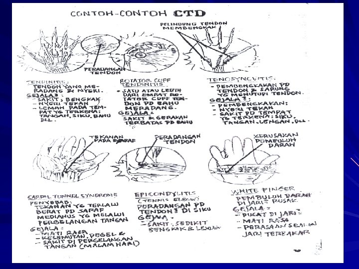 Contoh-contoh CTD Ø Tendinitis (tendon yang meradang & nyeri) Ø Rotator Cuff Tendinitis (satu atau lebih RCT pd bahu meradang) Ø Tenosynovitis (pembengkakan pd tendon & sarung tendon Ø Carpal Tunnel Ø Ø Syndrome Epicondylitis (peradangan pada tendon di siku White finger (pembuluh darah di jari rusak