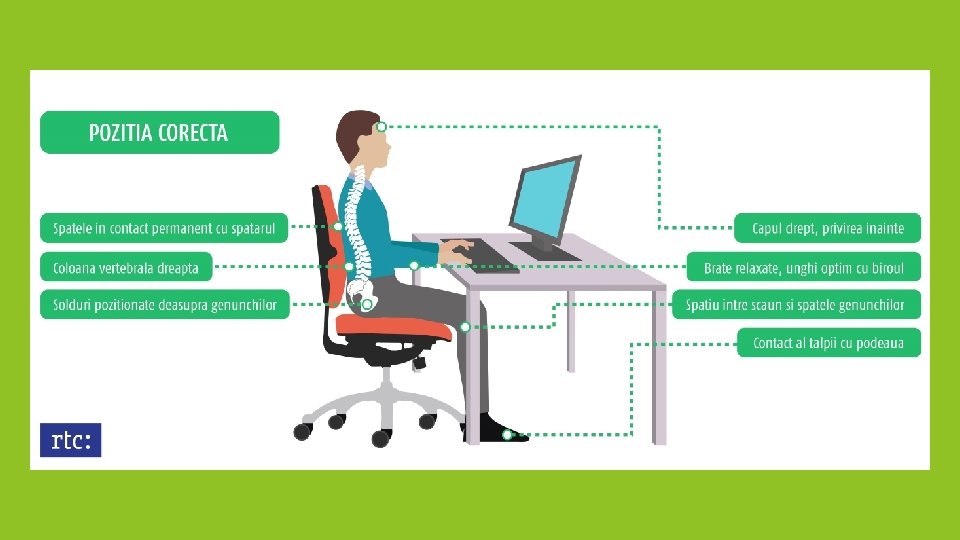 Poziția brațelor și picioarelor 1 Braţele să stea relaxat, paralel cu corpul, iar coatele să aibă un unghi de 90º-110º; Consilier școlar Elena Mihaela Bold 2 Principiul anterior se aplică şi pentru membrele inferioare (coapsele şi genunchii flectaţi la 90º 110º); altfel spus, ajusteazăţi înălţimea scaunului astfel încât picioarele să nu atârne, dar nici să nu stea îndoite;