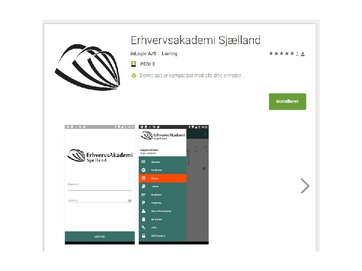 EASJ App • Fås til Windows Phone/Mobile, Android og i. OS – – – – Nyheder Skema Lektier Mine informationer Fraværsregistrering Skift password Karakterer • Søg på ”Erhvervsakademi Sjælland”