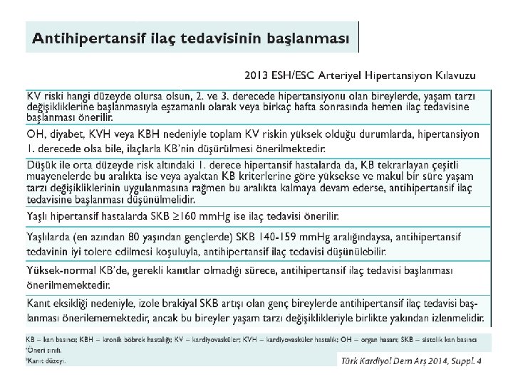Hipertansiyonda Tedavi Başlama Hipertansiyon evre Tedavi başlama yaklaşımı Evre 1 Hipertansiyon Bir-üç aylık takip sonrasında kan basıncı 140/90 mm. Hg üstü devam ediyorsa ilaç tedavisine başlanır Diyabetes mellitus, kronik böbrek hastalığı ve koroner arter hastalığı varlığında hemen başlanır. Hastanın günlük yaşam kalitesini etkileyen hipertansiyonla ilişkili semptomları varsa antihipertansif ilaç tedavisine daha erken başlanabilir Evre 2/3 hipertansiyon Hemen başlanmalı 20