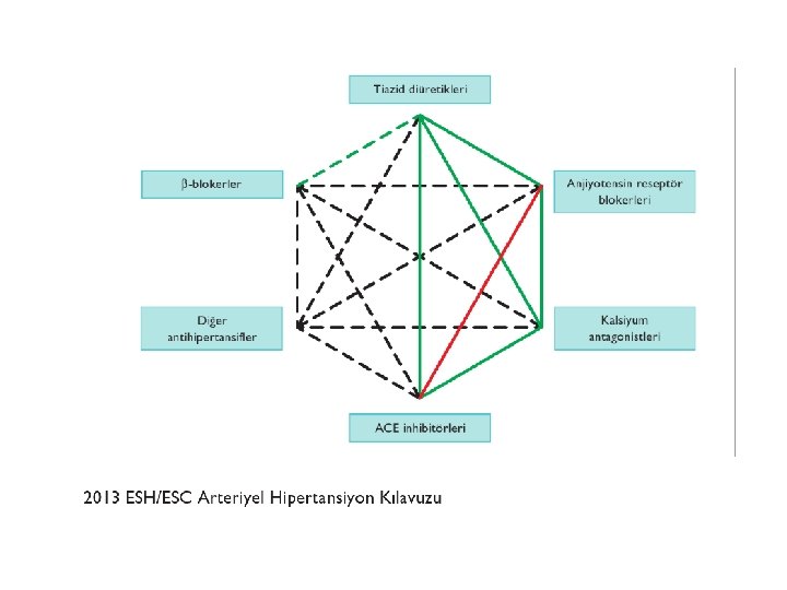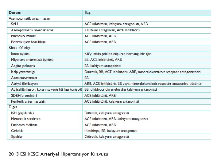 Başlangıç Olarak Hangi Antihipertansif İlaç ? • Hemen hemen tüm kılavuzlarda bu konuda konsensus mevcut • Spesifik comorbid durumlarda benzer antihipertansif ilaç grupları öneriliyor – Genel populasyon – Irk – İleri yaş (≥ 80 y) – DM – KBH ± proteinüri – KVH veya KVH risk profili (fragmingham risk skor)