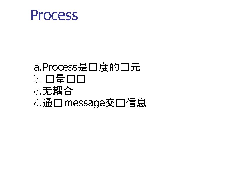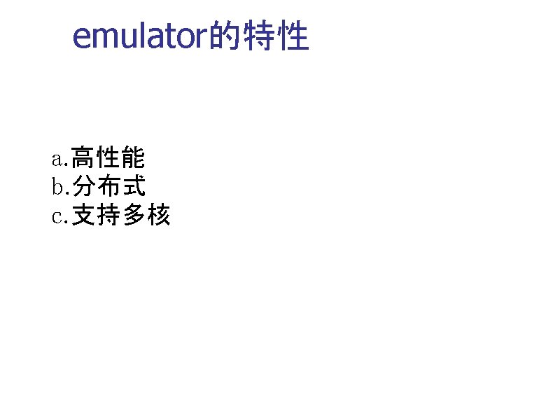emulator的物理�构 a. erlexec b. escript c. … beam Beam. smp Beam. hybird Beam Driver Sys Utilts tty_sl ram_file_drvz lib_drv udp_inet tcp_inet Efile async Unix Windows …