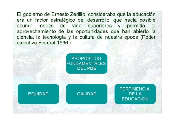 El Programa de Desarrollo Educativo 1995 -2000 Consideraba • la educación como un factor estratégico del desarrollo, que hace posible asumir modos de vida superiores y permite el aprovechamiento de las oportunidades que han abierto la ciencia, la tecnología y la cultura de nuestra época. • que el logro de la calidad implicaba una carrera continua en la búsqueda del mejoramiento, que requería de un esfuerzo constante de evaluación, actualización e innovación.