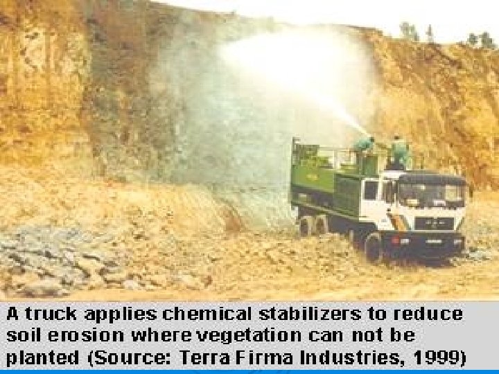 Chemical Stabilization Ø Chemical stabilizers, also known as soil binders or soil palliatives, provide temporary soil stabilization. Vinyl, asphalt, or rubber are sprayed onto the surface of exposed soils to hold the soil in place and minimize erosion from runoff and wind. These materials are easily applied to the surface of the soil, can stabilize areas where vegetation cannot be established, and provide immediate protection.