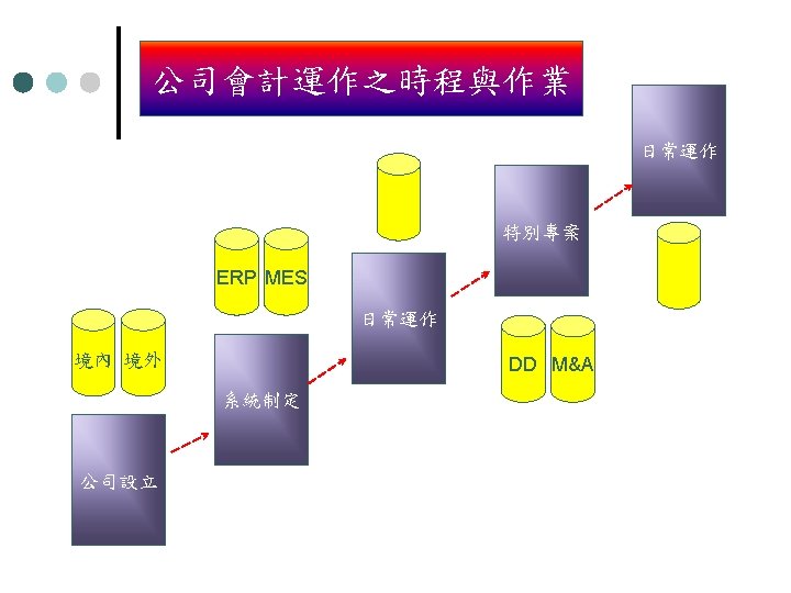 公司會計運作之時程與作業 公司運作之時程與作業 ERP MES §資訊發展計畫 Goal Business Process Application ERP + Infrastructure Notes W/F Architecture External Business Process Notes WF 系統制定 ? Internal Business Process Portal ERP (SAP) PDM 制度 SRM CRM SQM 保稅 HRIS Integration O. S. /Platform People MES EIS Project Security Network & Communication