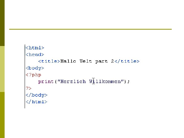 Grundlegendes für den PHP-Quellcode im Grunde ist es vollkommen egal an welcher Stelle des HTML-Dokumentes der PHP-Code steht p wichtig ist nur das er markiert ist und zwar so: <? php <? PHP-Code ? > p innerhalb dieser Markierungen können HTML-Tags genutzt werden, zum Bsp. um einen Text fett zu schreiben <b></b> p ganz wichtig ist das ; am Ende jeder Befehlszeile p
