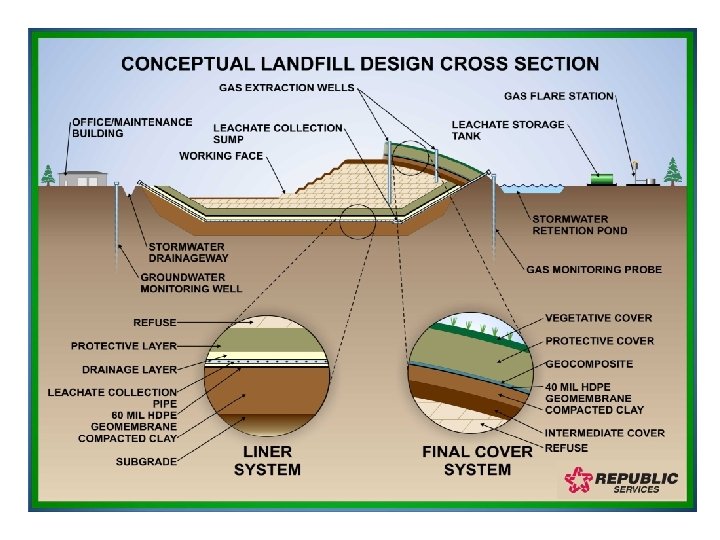 Landfill Design and Engineering - Key to design: barrier system at the base, sides and cap of the waste landfill. - Barrier liner system – from natural or synthetic materials – for protection of surrounding soil and groundwater. § To provide sufficient permeability and thickness requirements at least equivalent to the following: 1) For hazardous waste landfill sites, hydraulic conductivity (permeability) of ≤ 1. 0 x 10 -9 m/s, and liner material thickness of ≥ 5 m. 2) For non-hazardous waste landfill sites, hydraulic conductivity of ≤ 1. 0 x 10 -9 m/s, and liner material thickness of ≥ 1 m. 3) For inert waste landfill sites, hydraulic conductivity of ≤ 1. 0 x 10 -9 m/s, and liner materialthickness of ≥ 1 m. **hydraulic conductivity (permeability)-is the ease with which a fluid such as leachate will flow through the liner material