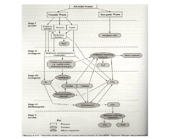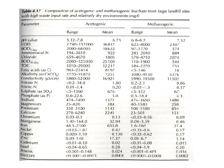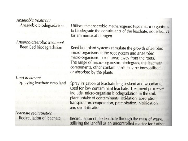 Comparison of early and late stage leachate Stage II / III Stage IV High content of fatty acids Low content of fatty acids Acidic (low p. H) Neutral or alkaline (p. H 7 -8) High BOD/COD ratio Low BOD/COD ratio High ammoniacal nitrogen Lower ammoniacal nitrogen High organic nitrogen Heavy metals in solution e. g Cr, Fe, Mn