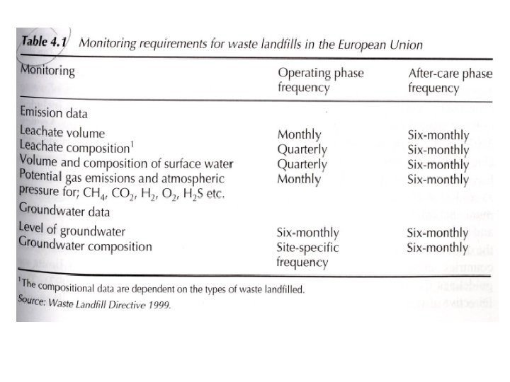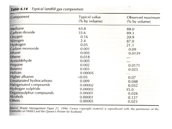 - Disadvantages: § Older sites of landfill – still under current use or have long been disused, were constructed before the environmental impacts of leachate and landfill gas were realized. - now, sources of pollution with uncontrolled leakage. - landfill gas can be hazardous, ex. largest component, methane can reach explosive concentrations, and also is a ‘greenhouse gas’, which has about 30 times the effect of CO 2. - constructed close to housing areas, and some have been built on disused landfill sites.