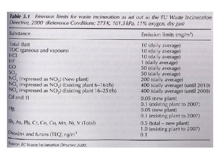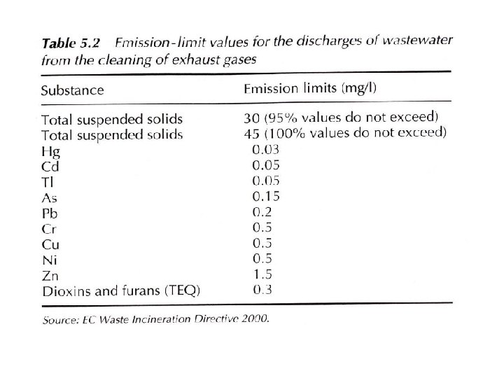 Gas clean-up Cyclones- remove particles larger than 15 µm, but incinerator particulates < 15 µm size. Thus, its only used as a preliminary collector, prior to electrostatic precipitator of fabric filter. Electrostatic Precipitators- the dust-laden gas stream enters EP, the particles are charged by –ve ions by corona discharge in an intense electrostatic field, then attracted to oppositely charged collector electrode plates, then the particles accumulate. Fabric Filters- consist of a series of elongated, permeable fabric bags through which the particulate-laden gas flow and filter out the particles from gas stream. Can remove particles with submicron size. Can be coated with additives where adsorption take place.