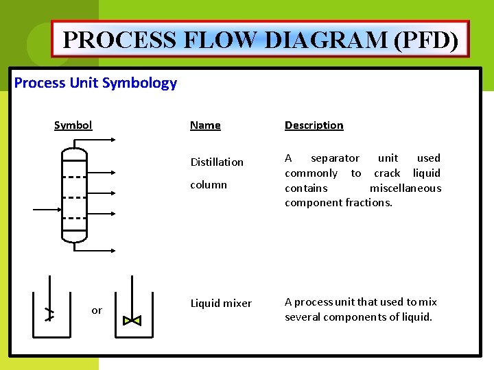 PROCESS FLOW DIAGRAM (PFD) Process Unit Symbology Symbol Name Description Stripper A separator unit used commonly to liquid mixture into gas phase. Absorber A separator unit used commonly to extract mixture gas into liquid phase.